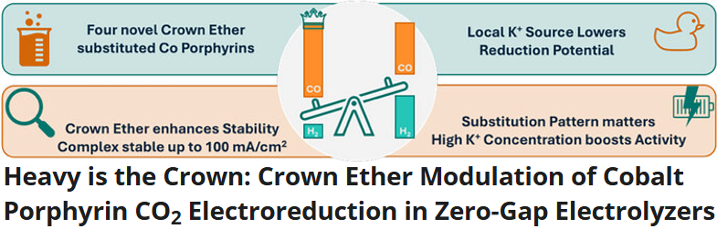 - Heavy is the Crown: Crown Ether Modulation of Cobalt Porphyrin CO2 Electroreduction in Zero-Gap Electrolyzers. Wiesner, W.; Wilhelm, C.; Hoffmann, R.C.; Stahl, P.; Pellumbi, K.; Jökel, J.; Ivanović-Burmazović, I.; Apfel, U., Angewandte Chemie, International